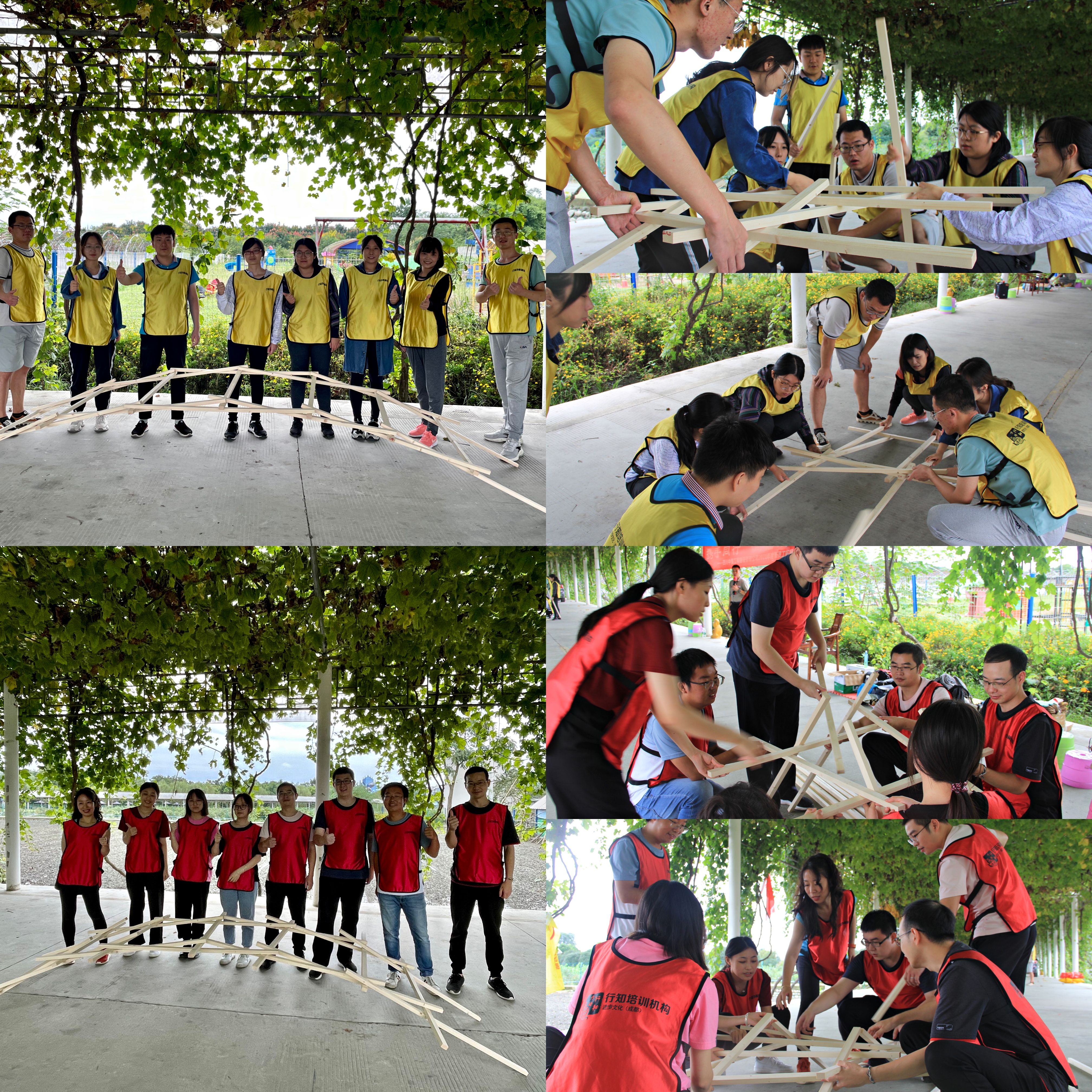 本次拓展活动共包括“快乐毛毛虫”、“企业文化价值卡”、“莱昂纳多桥”、“共绘蓝图”四个项目。在项目正式开始前,教练带领大家进行了一些热身、破冰的小游戏,增进相互间的认识,调动大家参与的积极性,引导大家转换思维,为后面项目的开展作铺垫。随后,大家开始组建团队,选队长、队秘、旗手,创作队名、队旗,编口号,并进行团队展示。本次活动的两个队伍分别为“金光闪闪队”、“火箭队”。有了前面的热身铺垫,大家都热情高涨,激情四溢,时刻准备着迎接下面的挑战。