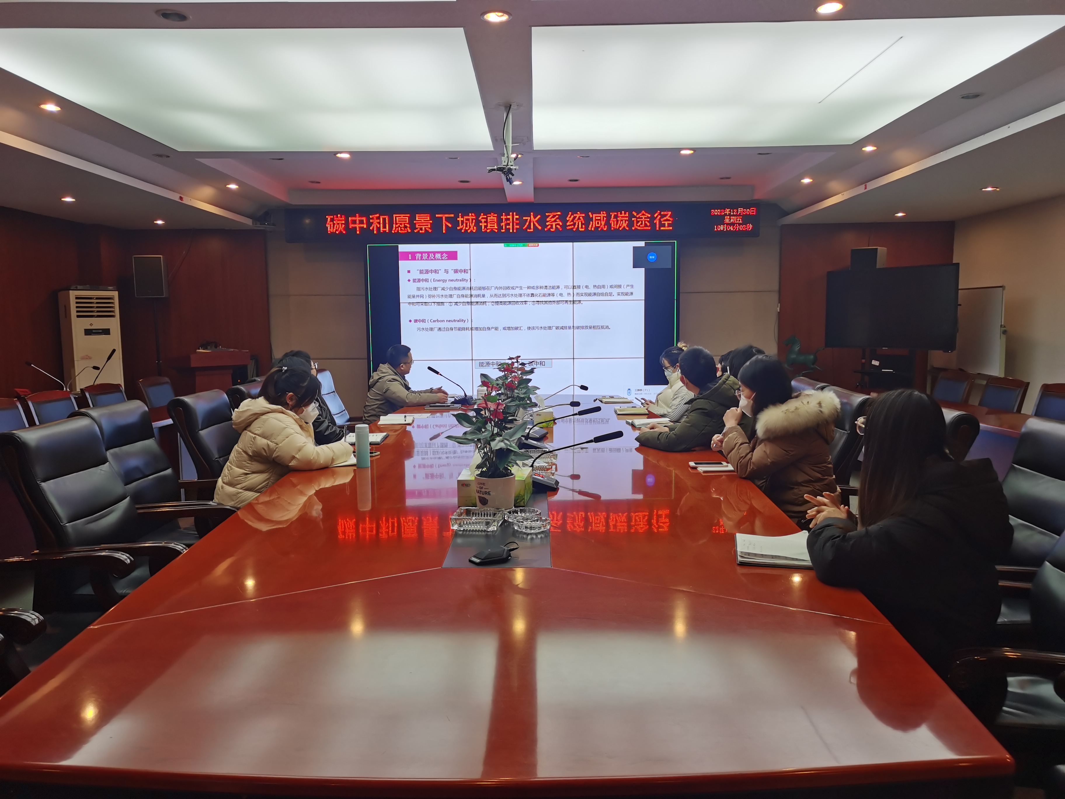 在分享交流会上,王麒麟主要从相关背景及概念、全生命周期碳排放、污水处理系统减碳途径等几大方面进行了介绍,并从低碳创新现状、碳排放分析、减碳策略分析、减碳途径等方面对污水处理系统的减碳途径进行了重点讲解,同时结合国外碳中和案例分析对相关的节能措施和减碳技术做了进一步的介绍。分享结束后,参训人员还就工作中遇到的相关问题做了进一步的互动交流。