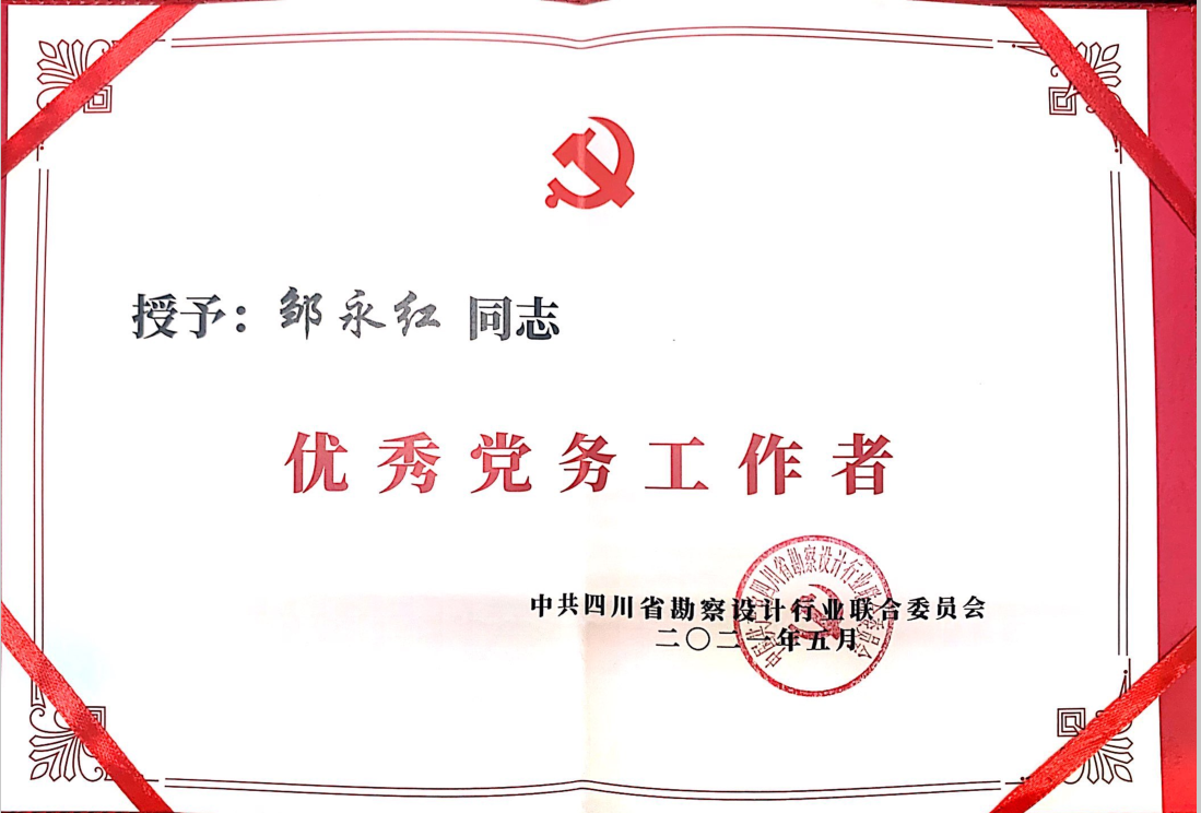 千亿qy88国际官网入口工程设计院党支部书记邹永红同志荣获中共四川省勘察设计行业联合委员会颁发的“优秀党务工作者”荣誉称号。