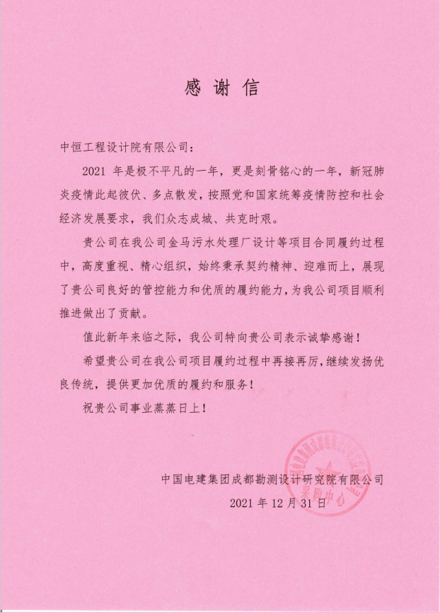 2021年12月31日,千亿qy88国际官网入口设计院有限公司西部业务区设计研究三院收到来自中国电建集团成都勘测设计研究院有限公司的感谢信,高度赞扬了设计研究三院在金马污水处理厂等项目履约过程中“高度重视、精心组织、迎难而上”的服务精神,并对我司良好的管控能力和优质的履约能力给予了充分肯定!